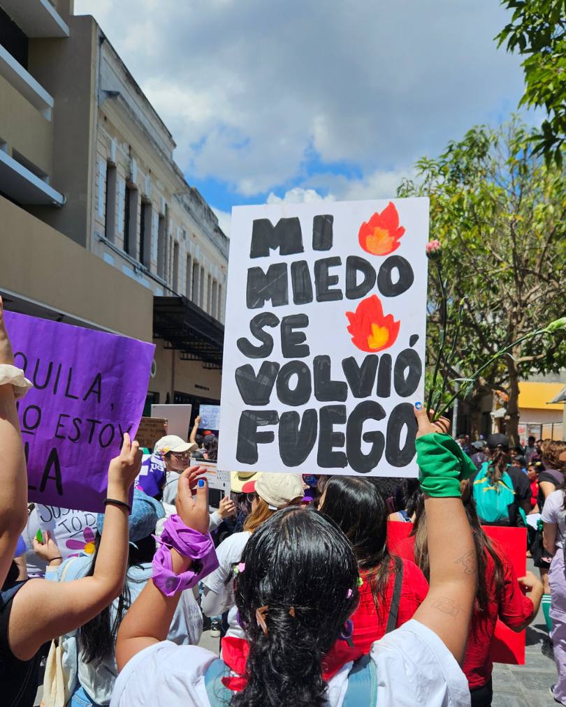 El trayecto fue vibrante. Vi arte, juventud, madres e hijas reclamando justicia por los femicidios, menstruación digna, aborto seguro y libertad para Palestina. Incluso me sorprendió gratamente ver al Departamento de Equidad de Género de la Policía Nacional informando sobre violencia digital, un avance que aplaudo de pie.